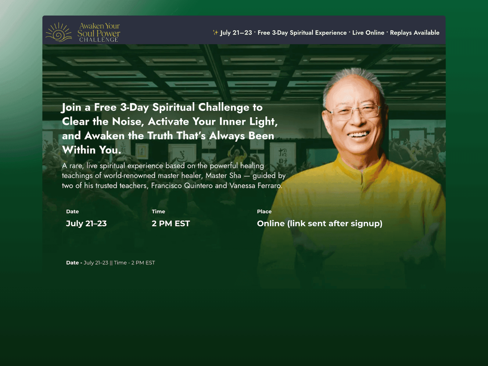 The Awaken the Soul Power Challenge was a free 3-day live online experience designed to help participants clear energetic blocks, activate their inner light, and reconnect with their soul — guided by Master Sha's Tao healing methods. The funnel needed to honour the sacredness of the content while being built with the conversion architecture to grow the community at scale.